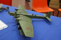 material is stretched over a wooden skeleton, providing the space with a warm ambient light, as well as a domed roof canopy. For a second time the show was arranged as a cooperative event of the PMC-Kurpfalz and MFM modeling clubs. Clubs from around the region as well as some foreign clubs presented their masterpieces. With an accent on plastic scale modeling, there was also an area for the remote-control fans: a closed off dirt track for trucks, excavators etc, as well as an area closed off by a net, behind which the indoor flyers presented their tricks. A number of vendors with an interesting selection of models, and a kid’s modeling corner rounded off the event. During the two day the show, many modeling enthusiasts visited, made new connections and met new friends. Near the entrance entry, just after the first three vendor stands, was the PMC Mannheim display. This display was a 6 square yards museum of technology in 1/144th scale, mostly with planes, yet all complete with trucks, trains, subs and many others never-seen-in-hardware prototypes. Directly adjacent a number of ships in 350th scale were lined up, well done, and all equipped with the finest photo-etch details. “They each take about a year to make”, said their owner Martin. Further down the table, a lineup of mottled, spotted or otherwise camouflaged 48th scale places lead to my personal highlight—a large collection of big-scale models by Peter Doll, most of them early jets, in an amazing bare-metal finish. There were some Sabres in US and German markings, a number of Starfighters, a Hustler, a Thunderjet and others. Asked how he made this amazing shiny aluminum, he answered simply: “It is aluminum.” Nothing beats the real thing! He used strips of thin regular kitchen foil, and Humbrol basic clear varnish as a glue. For the incredibly realistic corrosion, there’s a trick, too: the foil was boiled together with bits of egg shell: all together an unbelievably life-like effect. The next highlight (kindly skipping a collection of my large-scale youth-time models) was just around the table corner: Aleks Sekularac’s complete collection of highly-praised Red Star sensations, including his famous TB3 Zveno, two La5s, the LaGG3 and the mottled I-153 Chaika. Next to that, I placed my humble collection, including my recently medaled An-2, and the Breda 27 presented in last Month’s Internet Modeler. Adjacent to that, some interesting models of more exotic planes like the C-7 or C-23 were displayed, together with some excellent helicopter models in 1/72nd scale. The table round was concluded with some 1/72nd scale models of World War I tanks, and two Fw-190s with covered tail marking. No swastika markings can be publicly displayed in model shows in Germany, which means they need to be covered. Imagine the effect on a Finnish WWII plane! On the next table, next to the permanently buzzing indoor-flyers, the Mainz model club displayed some fantasy figures and dioramas. One of most striking was a fifties road cruiser with Che posters on a fence in the background. Obviously, this was inspired by a Cuban vacation! |